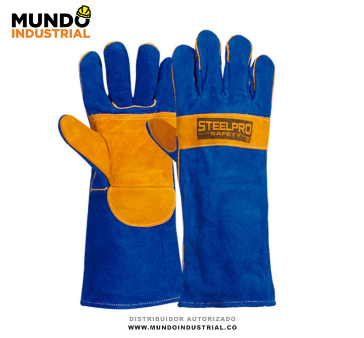 Guante Steelpro Safety para trabajos de soldadura, fabricado en carnaza color azul rey/naranja. Guantes para soldar largos con refuerzo en gatillo.