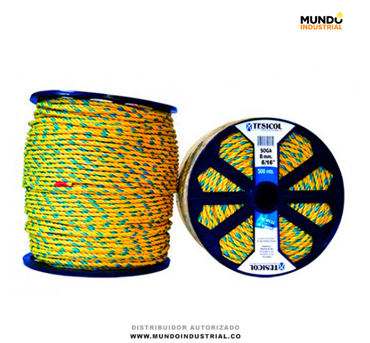 Asesoría PersonalizadSoga retorcida en rafia fibrilada de polipropileno 100% virgen, de alta resistencia y suavidad. Fabricada en color amarillo pinta azul