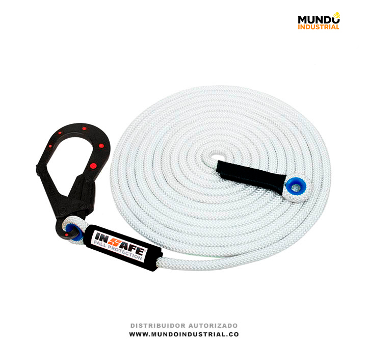 Cuerda Torcida de 16 mm en polyester con gancho dieléctrico de 2 1⁄4 en un extremo, con guardacabos plásticos y termo formado, en los extremos para evitar la fricción, es usado como parte de un sistema de detención de caídas.